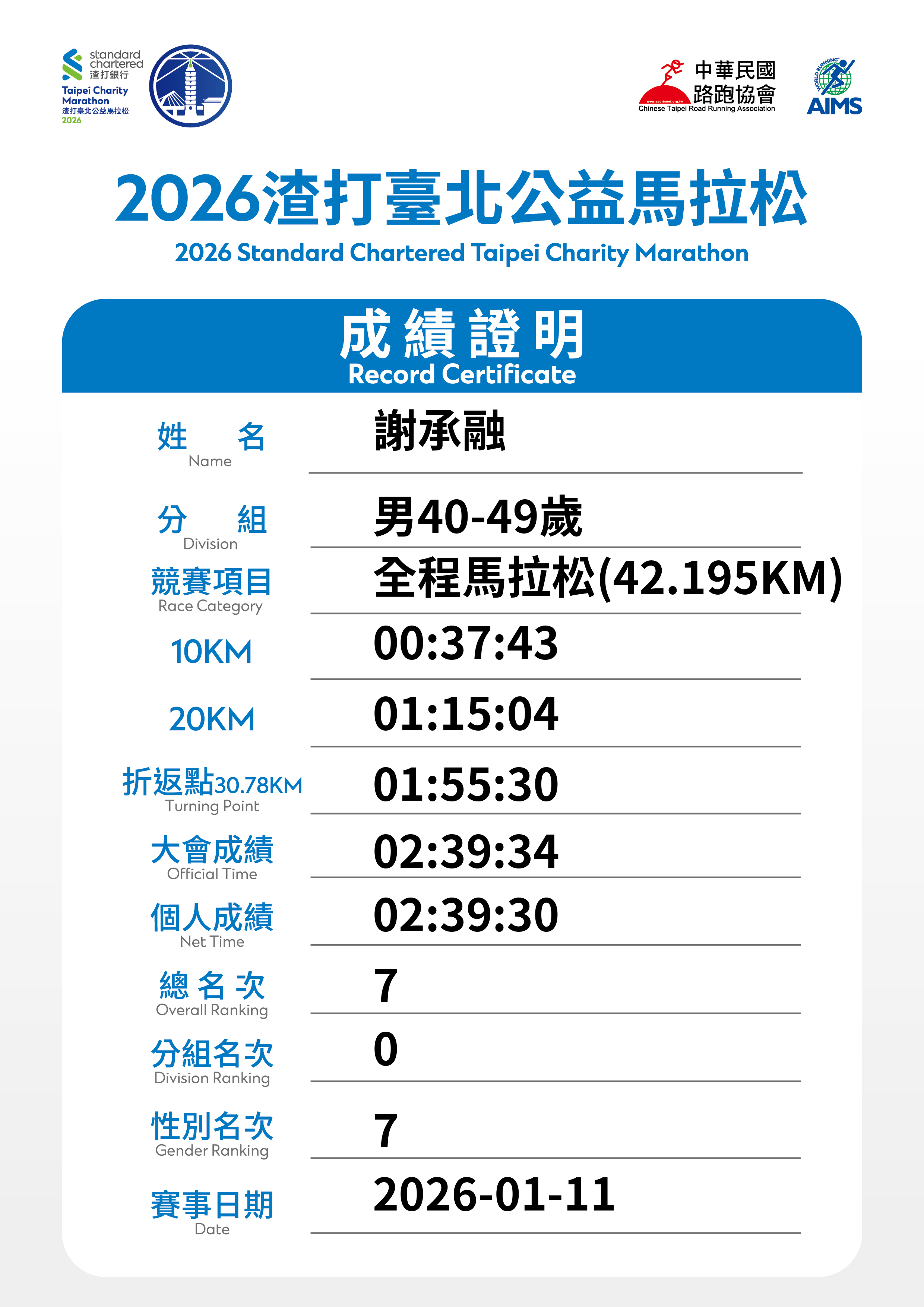 大會成績 Official Time