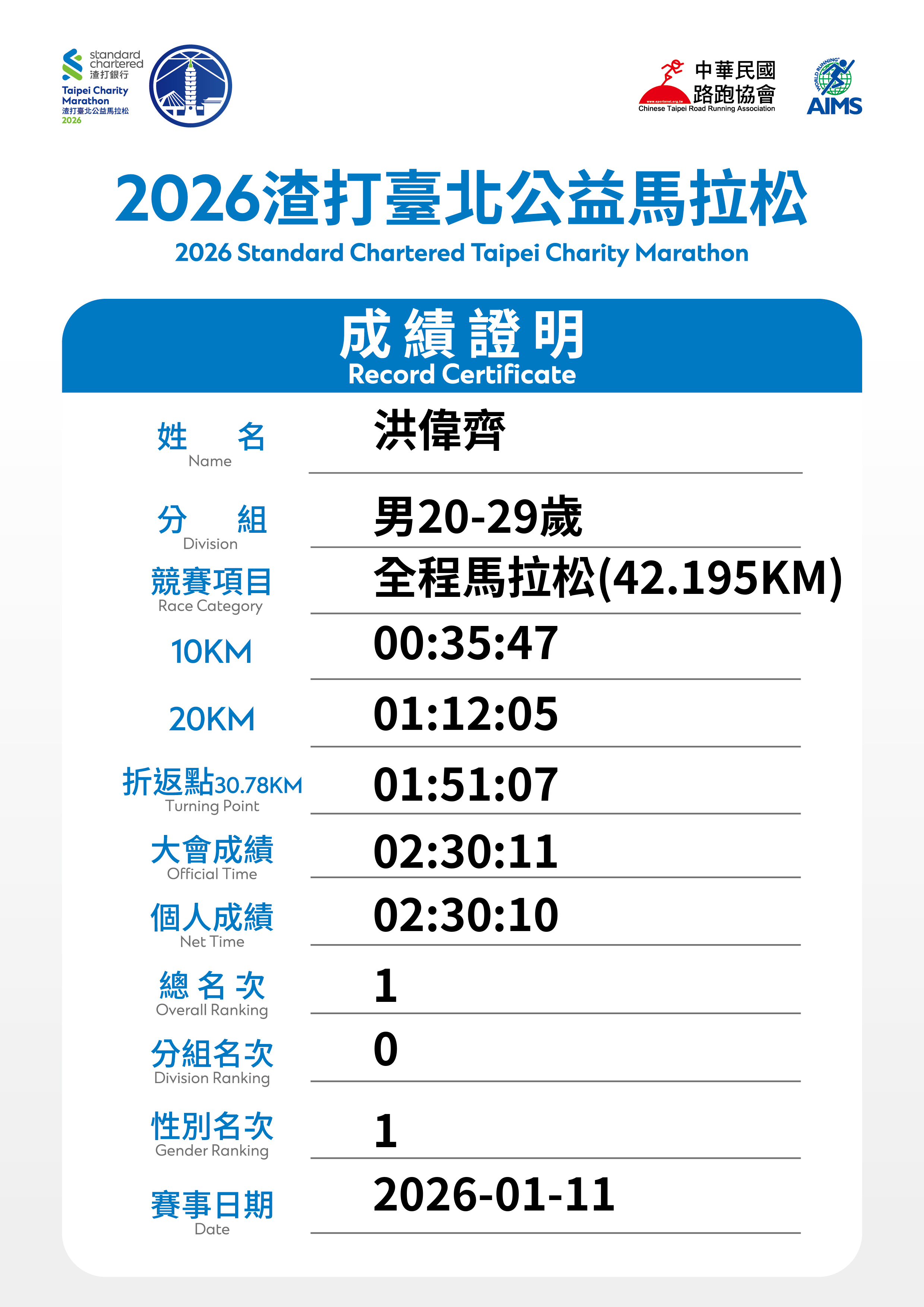 大會成績 Official Time